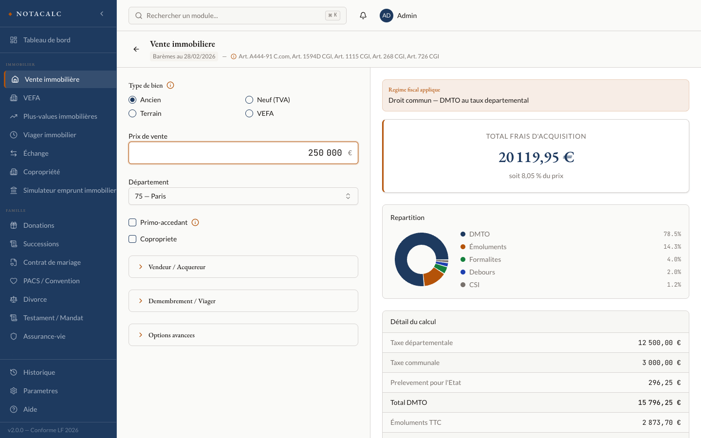 DMTO, émoluments, plus-values, successions, donations — 23 modules couvrent l'intégralité de votre pratique. Chaque résultat est détaillé avec ses références légales.